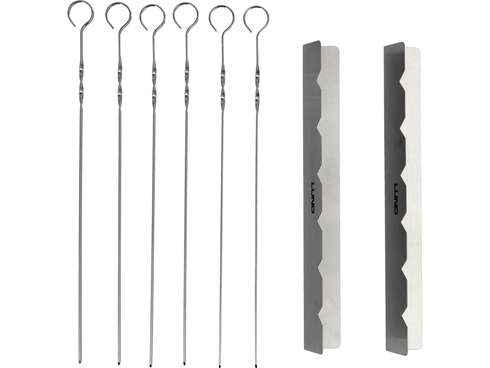 6 tērauda šķēpiņi šašlikiem ar stabilu pamatu ērtai pārklāšanai un pārlikšanai pārtikas