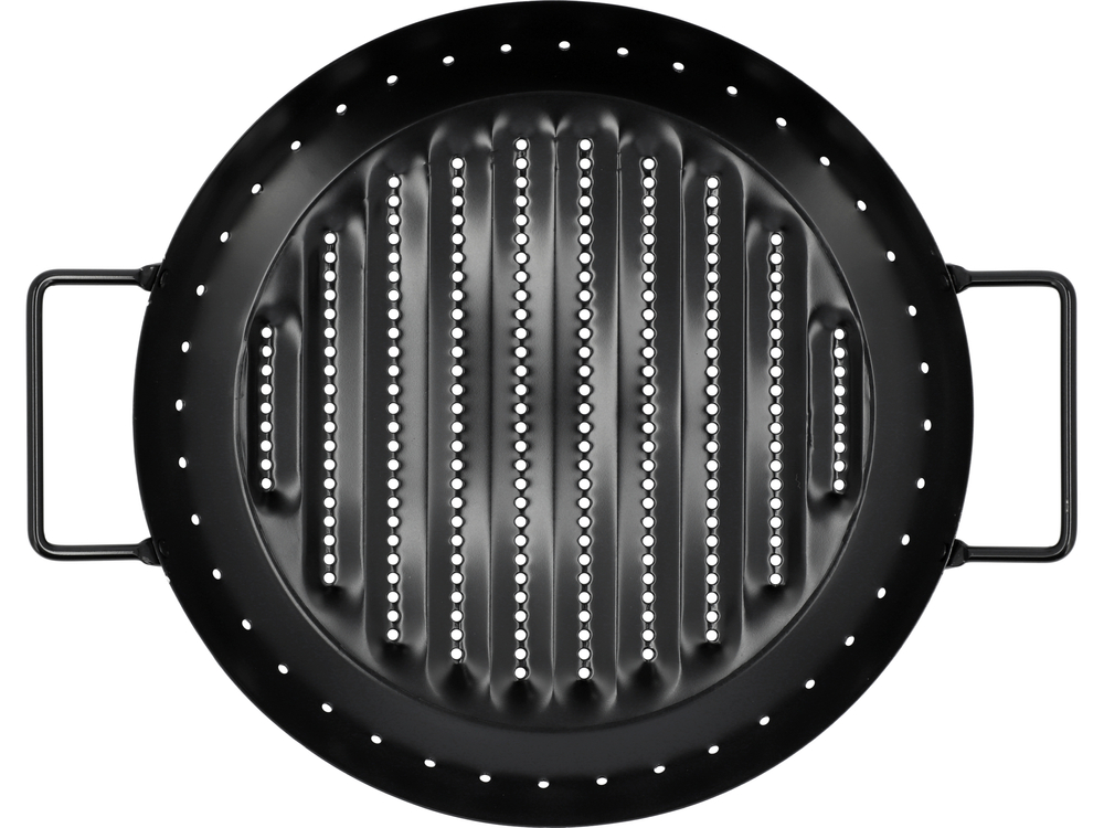 - viegli ribota pannas virsma novērš pārmērīgu ēdienu pielipšanu. Daudz caurumu pamatnē un sānos nodrošina labāku siltuma un dūmu cirkulāciju un efektīvāk novada lieko tauku