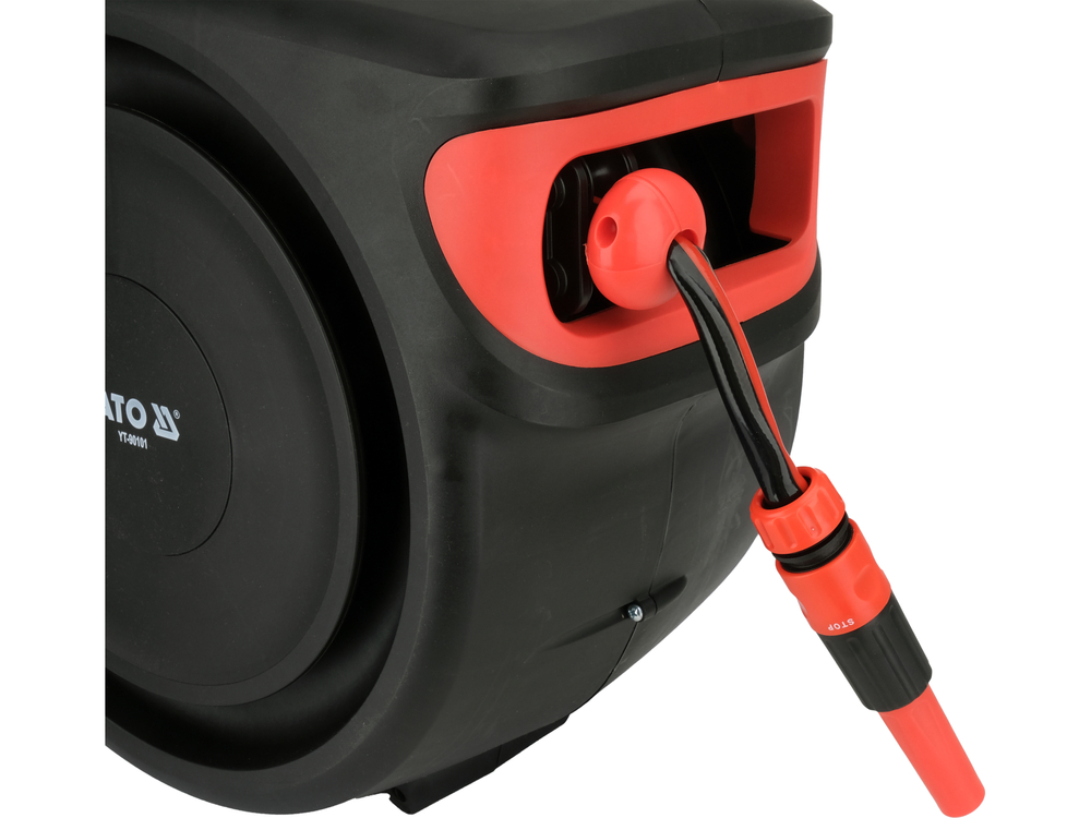 Dārza čūska ar automātisku 25 metru garu sarullētāju, kas pastāvīgi uzstādīts uz sienas. Tas atvieglo telpas organizēšanu, paātrina čūskas izvilšanu un sarullēšanu pēc laistīšanas beigām un nodrošina tā glabāšanu bez locījumiem un mezgliem. Pilnīga tā paslēpšana būrī palīdz saglabāt kārtību gan dārzā, gan pie mājas.