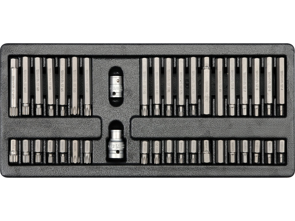 Įrankių spintelės įdėklas su įvairių dydžių atsuktuvų antgaliais.