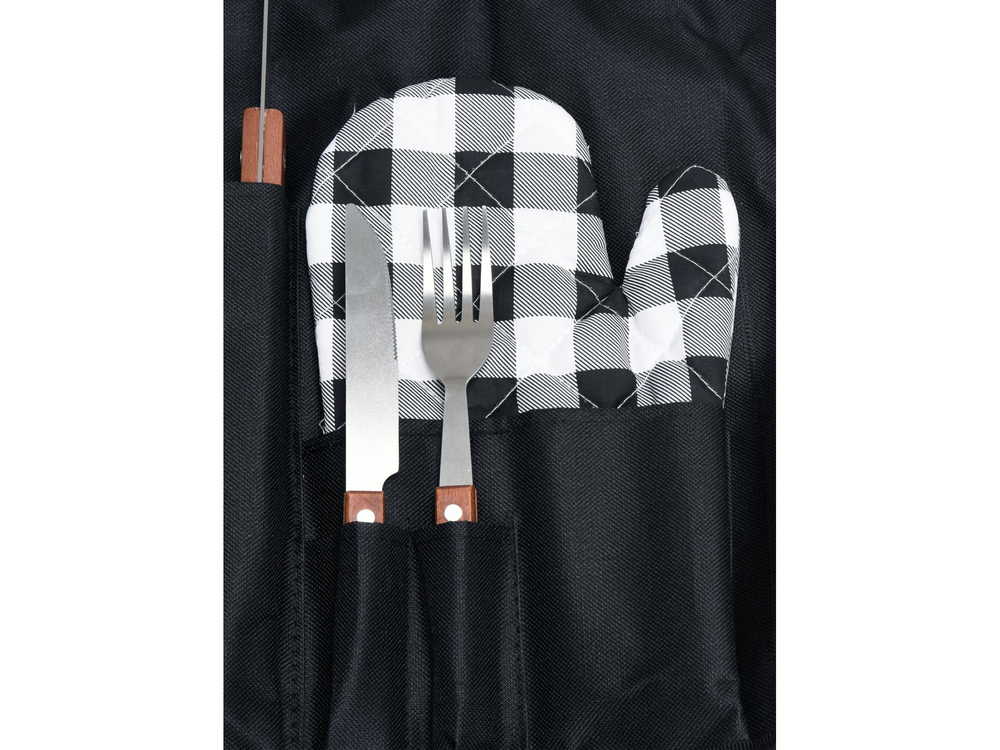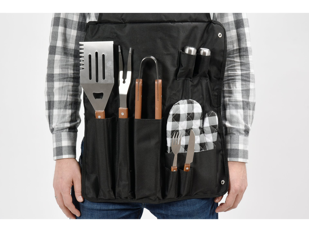Būtinas rinkinys visiems kepsninės entuziastams. Specialiai suprojektuotoje prijuostėje kepsninės reikmenys visada po ranka, o laikant prijuostė tarnauja kaip dangtis.