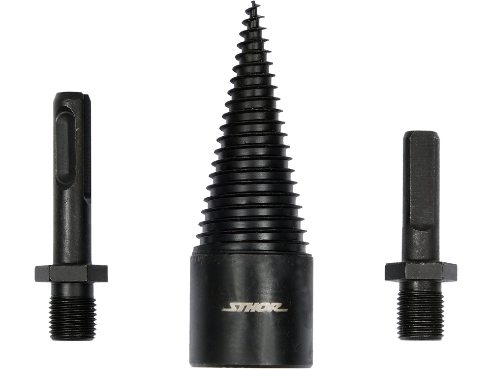 Medienos skaldymo grąžtas. Komplekte yra SDS Plus griebtuvas ir griebtuvas su trimis plokščiais paviršiais.