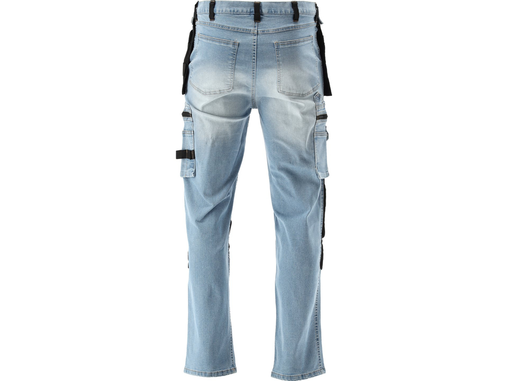 Darbinės darbinės kelnės iš elastingo džinsinio audinio yra pasiūtos iš trinto ir elastingo džinsinio audinio su elastanu. Jose yra net 17 kišenių, iš kurių 1 užsegama lipuku, 2 užsegamos užtrauktuku ir 2 nuimamos montuotojo kišenės iš patvarios medžiagos, padedančios organizuoti staliaus, stogdengio ar santechniko darbą.