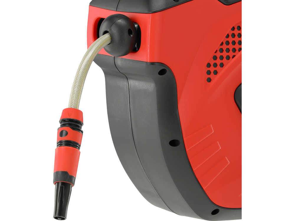 Vandens žarna ant automatinės ritės tvirtu korpusu. Dėl automatinio stabdymo mechanizmo laidas vyniojamas tolygiai. Žarna yra atspari UV spinduliams ir gali būti montuojama ant sienos.