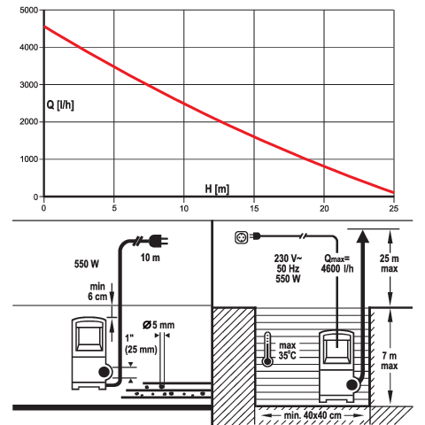 - didžiausias įsiurbimo aukštis: 25 m: 7 m