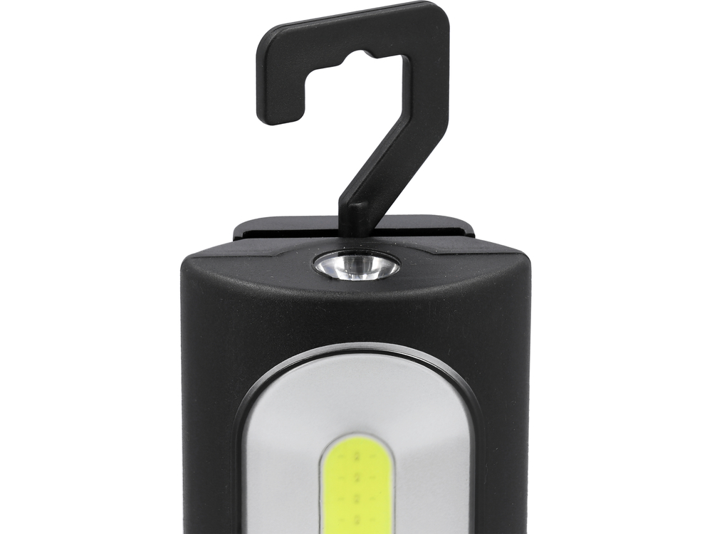 Lengvas nešiojamasis dirbtuvių šviestuvas su keturiais veikimo režimais, leidžiančiais pritaikyti šviesą prie atliekamos veiklos ir akumuliatoriaus įkrovos lygio. Papildomas priedas - spaustukas, magnetas ir kabliukas šviestuvui pakabinti.