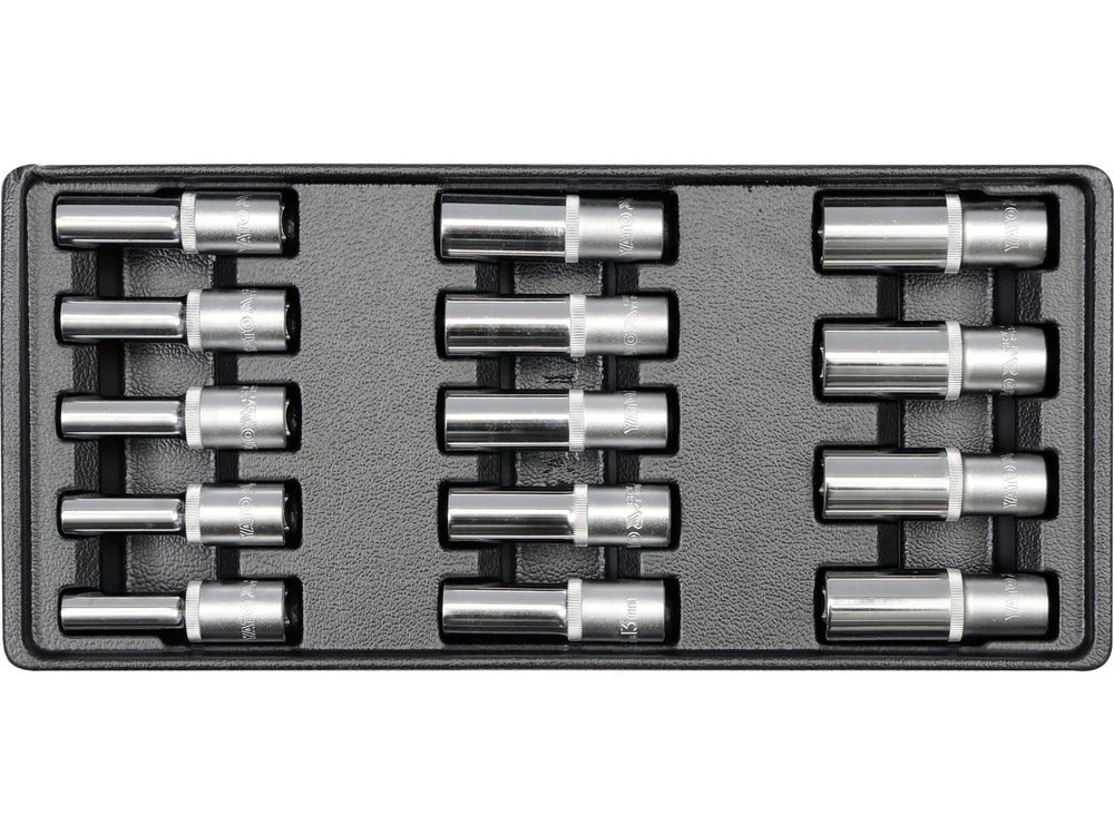 Wkład do szafki narzędziowej zawierający 14 rozmiarów nasadek sześciokątnych długich 1/2".