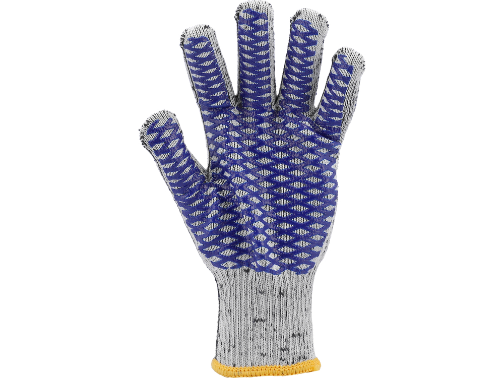 Rękawice bawełniane w części chwytnej powlekane PVC w kształt siatki, co zapewnia dużą chwytność i odporność na ścieranie.