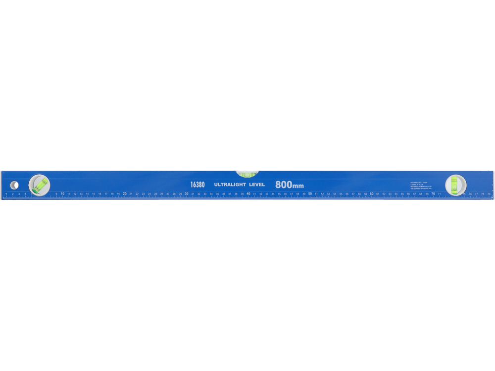 Poziomnica wykonana z profilu aluminiowego. Posiada trzy libele wskazujące pion, poziom i kąt 45 stopni. Na korpusie naniesiona podziałka milimetrowa ułatwiająca oznaczanie punktów na materiale.