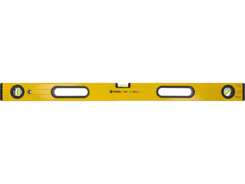 Poziomnica wykonana z profilu aluminiowego. Posiada dwa uchwyty oraz trzy libelle do wyznaczania pionu, poziomu i kąta 45°. Końcówki poziomnicy, a także oprawa libelli zabezpieczone przed uszkodzeniem wkładkami z elastycznego tworzywa.