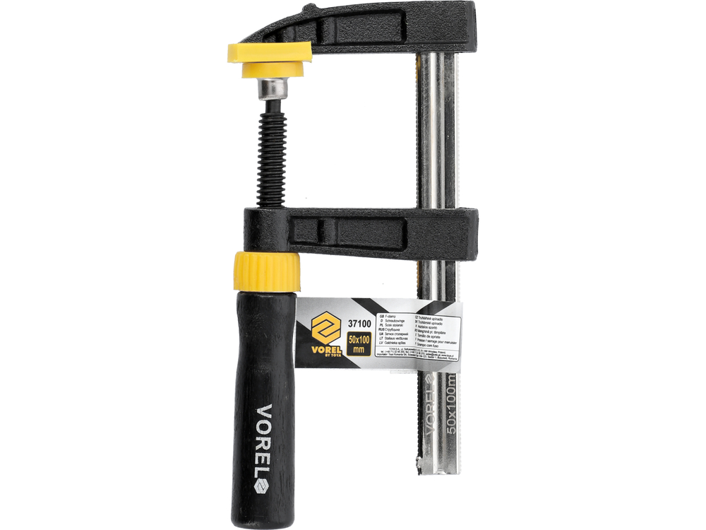 - Mocny ścisk śrubowy typu F z drewnianą rękojeścią.