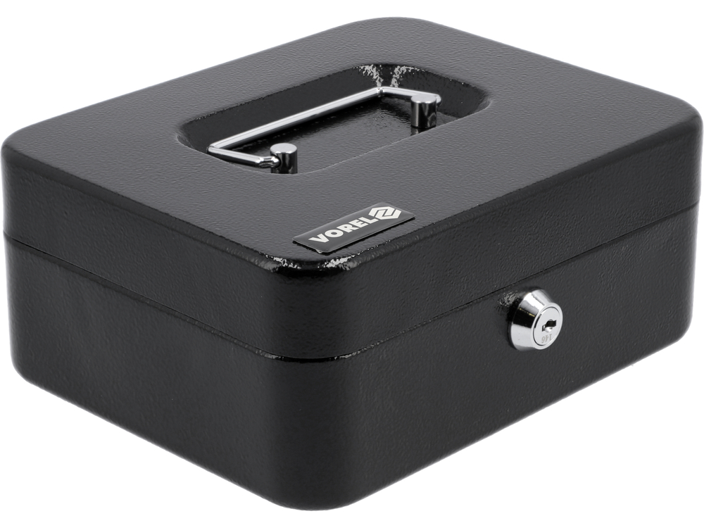 Przenośna kaseta na pieniądze o wymiarze 200x160x90mm. Wykonana z blachy stalowej o grubości 0,7mm, pomalowana w kolorze czarnym. Zamykana na zamek. W zestawie znajdują sie 2 klucze. Wewnątrz wyciągana wkładka na monety wykonana z tworzywa sztucznego.