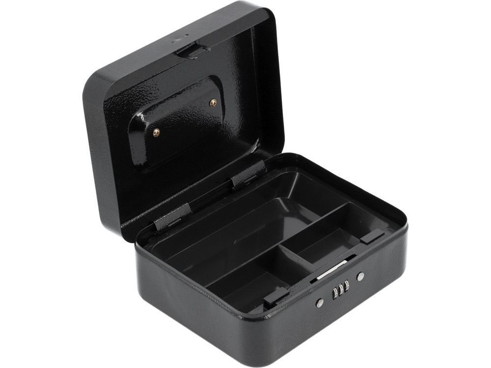 Przenośna kaseta na pieniądze o wymiarze 200x160x90mm. Wykonana z blachy stalowej o grubości 0,7mm, pomalowana w kolorze czarnym. Zamykana na zamek szyfrowy. Wewnątrz wyciągana wkładka na monety wykonana z tworzywa sztucznego.