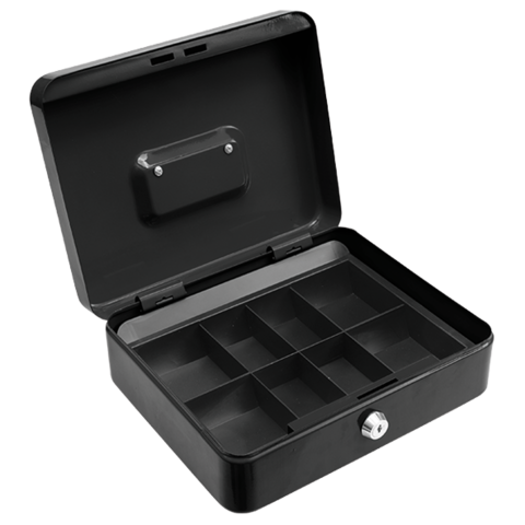 Przenośna kaseta na pieniądze o wymiarze 250x200x90mm. Wykonana z blachy stalowej o grubości 0,7mm, pomalowana w kolorze czarnym. Zamykana na zamek. W zestawie znajdują sie 2 klucze. Wewnątrz wyciągana wkładka na monety wykonana z tworzywa sztucznego. Podręczna kaseta do bezpiecznego przechowywania pieniędzy. 2 klucze