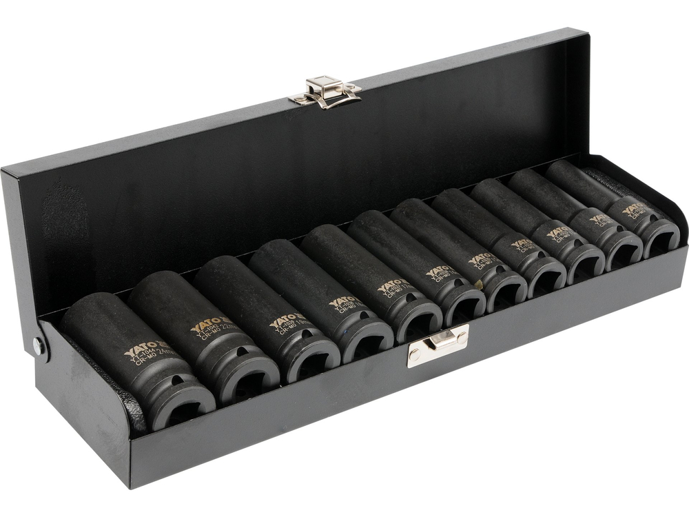 Nasadki udarowe Yato długie - komplet 11 kluczy nasadowych. Specjalistyczne nasadki udarowe, współpracują z urządzeniami pneumatycznymi, które pracują w bardzo ciężkich warunkach pod zmiennymi obciążeniami.
