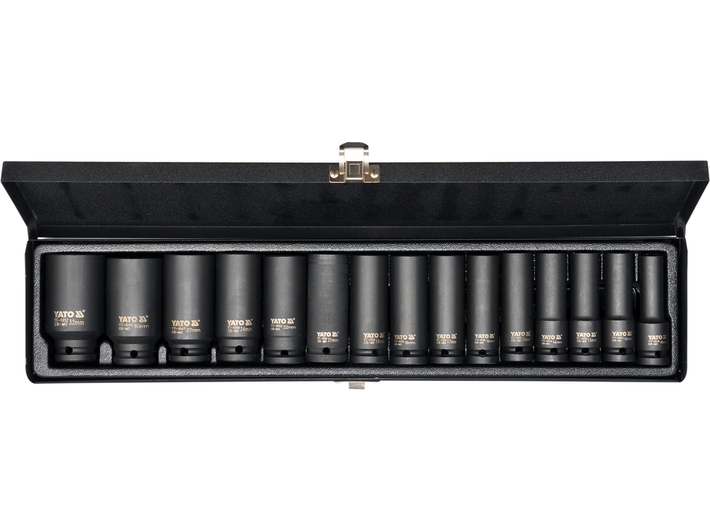 Nasadki udarowe Yato długie - komplet 15 kluczy nasadowych. Nasadki szczególnie polecane do profesjonalnych serwisów ogumienia oraz samochodowych.