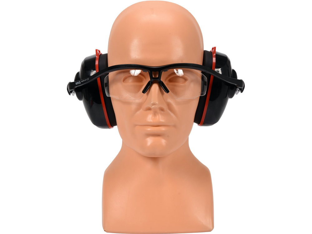 Nauszniki przeciwhałasowe zintegrowane z wymiennymi bezbarwnymi okularami ochronnymi YT-74636 chronią nie tylko słuch ale i oczy użytkownika. Zauszniki z regulacją na przegubach kulowych jednocześnie pełnią funkcje pałąka, co umożliwia pracę np. w kasku ochronnym bez dodatkowego ucisku głowy.