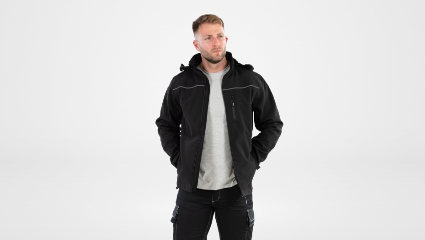 Kurtka softshell z trzema zapinanymi za pomocą wodoodpornego zamka błyskawicznego kieszeniami oraz z odpinanym kapturem.