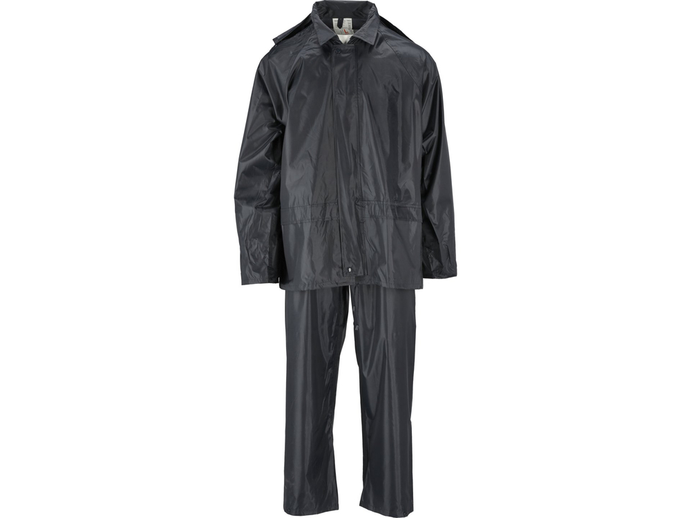 Komplet przeciwdeszczowy 2-częściowy marki Vorel. Kurtka z dwiema dużymi kieszeniami i regulowanym kapturem, spodnie z rozciągliwą gumką w pasie oraz ze szczelinami po bokach przez które możemy sięgnąć do kieszeni spodni.