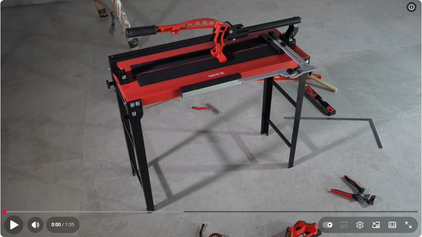 Przecinarka do płytek o długości 600 mm, zespolona ze stalowym stołem z rozkładanymi nogami, wyłożonym twardą techniczną gąbką.