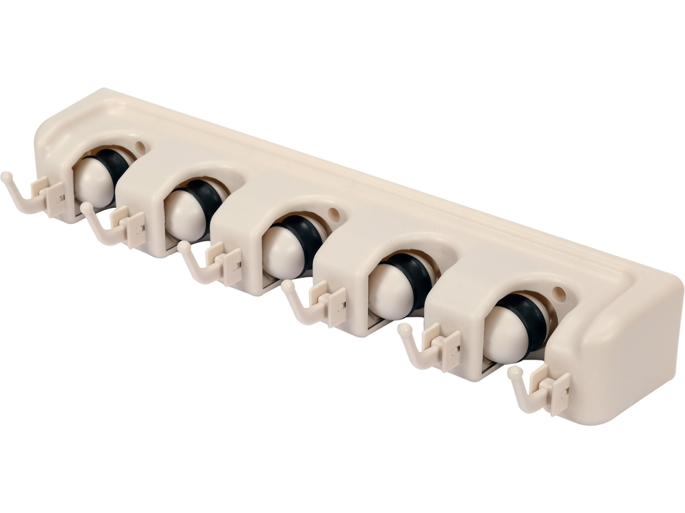 Praktyczny naścienny wieszak na narzędzia ogrodowe i domowe. Posiada 5 automatycznych uchwytów dopasowujących się do grubości trzonka oraz 6 składanych haczyków. Dociski uchwytów działają grawitacyjnie