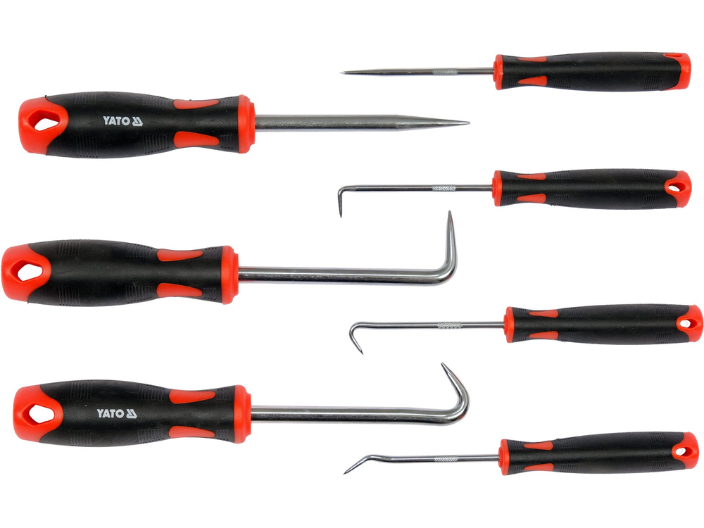 Zestaw haczyków z rękojeścią posiada hartowane i chromowane groty wykonane ze stali 40Cr. Rękojeść wykonana jest z dwukomponentowego tworzywa ułatwiającego pewny uchwyt. Zestaw wykorzystywany jest do prac precyzyjnych takich jak: