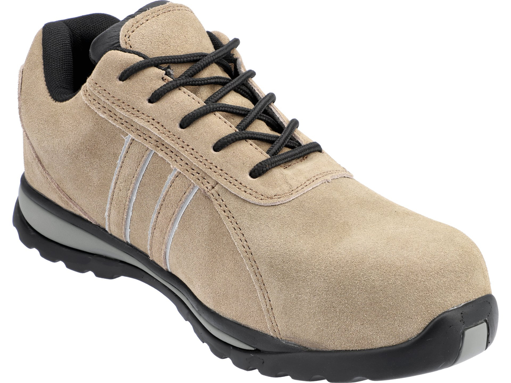 Półbuty nie zawierają metalu. Zarówno wkładka antyprzebiciowa, jak i gumowa podeszwa są elastyczne i - w przeciwieństwie do butów z tradycyjną podeszwą z PU i wkładką stalową - nie ograniczają zgięć śródstopia. Cholewkę z naturalnej skóry zamszowej ozdobiono odblaskowymi wstawkami poprawiającymi widoczność użytkownika.
