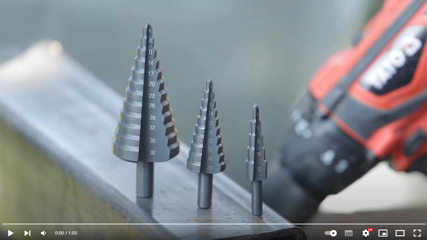Zestaw trzech wierteł stopniowych do wiercenia w wysokogatunkowej stali nierdzewnej, stali konstrukcyjnej, stali walcowanej na zimno, metalach kolorowych, blachach stalowych i tworzywach sztucznych.