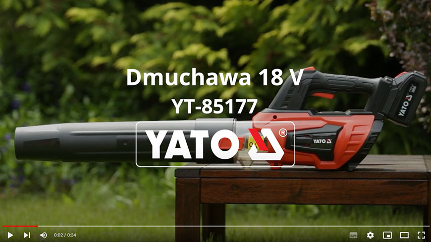 Mocna dmuchawa do liści zasilana akumulatorem systemu Yato 18V. Przycisk Turbo zwiększa przepływ osiowy, dzięki czemu strumień powietrza osiąga prędkość max. 126km/h.