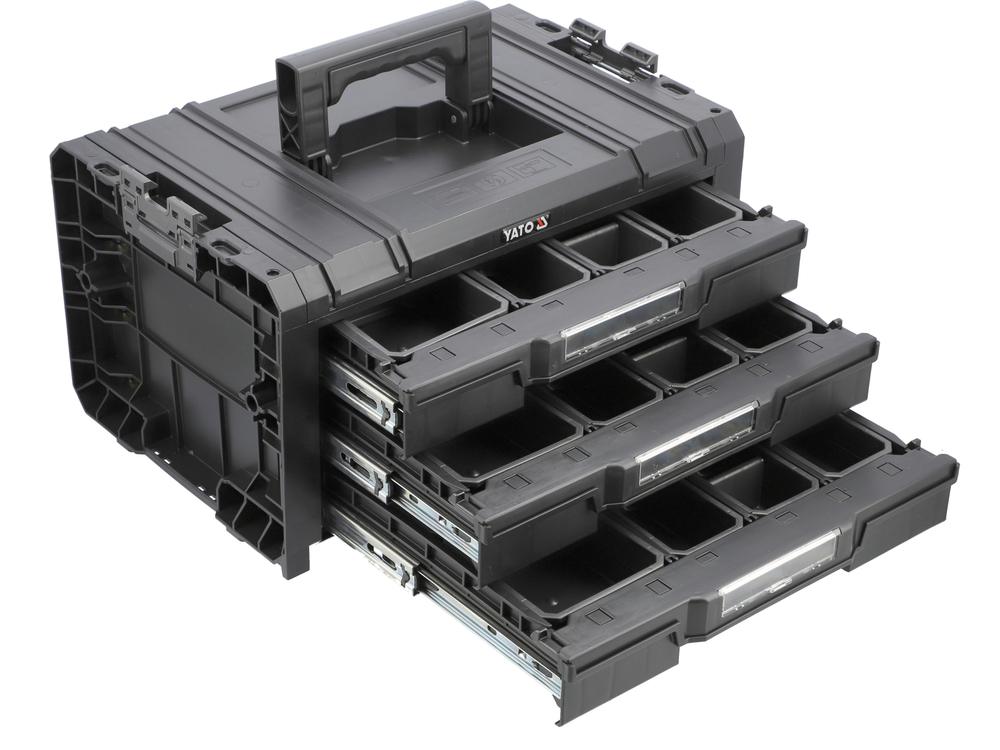 Mobilna skrzynka z trzema szufladami wyposażonymi w demontowalne przegrody i kubełki na drobiazgi. Jej przydatność zwiększa możliwość zamontowania na jeżdżącej platformie oraz na skrzyni z kołami z systemu S1 i S12. Dzięki konektorom można ją połączyć z każdym elementem systemu. Kilka połączonych skrzyń na platformie z kółkami stworzy mobilny wózek narzędziowy.