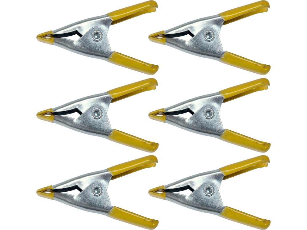 Ściski sprężynowe wykonane z cynkowanej blachy stalowej. Uchwyty i końcówki robocze pokryte żółtym winylem.
