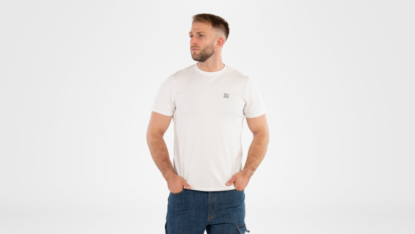 Tradycyjny koszulkowy materiał o wysokiej gramaturze z 95% zawartością bawełny i 5% domieszką elastanu to połączenie przyjemnego dla skóry dotyku i podwyższonej elastyczności. Koszulka nie krępuje ruchów. Rozciąga się i wraca do pierwotnego kształtu, nawet po wielu miesiącach użytkowania. Dla uzyskania efektu slim-fit polecamy wybrać rozmiar mniejszy niż w koszulce bez elastanu.