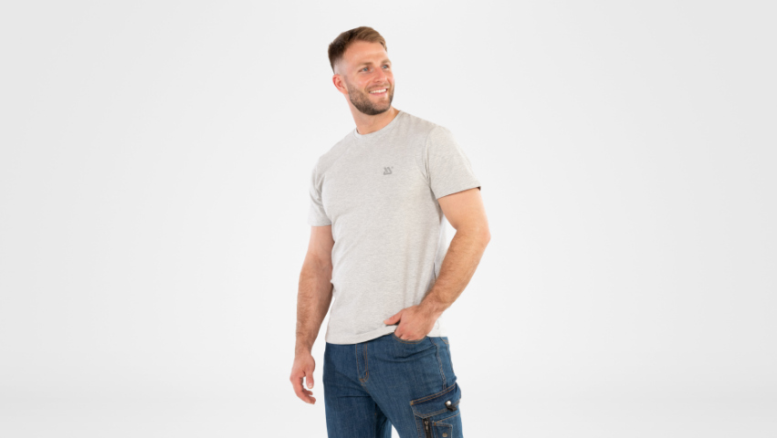 Tradycyjny koszulkowy materiał o wysokiej gramaturze z 90% zawartością bawełny oraz 5% domieszkami elastanu i wiskozy to połączenie melanżowego koloru z przyjemnym dla skóry dotykiem i podwyższoną elastycznością. Koszulka nie krępuje ruchów. Rozciąga się i wraca do pierwotnego kształtu, nawet po wielu miesiącach użytkowania. Dla uzyskania efektu slim-fit polecamy wybrać rozmiar mniejszy niż w koszulce bez elastanu.