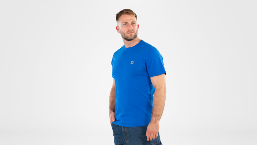 Tradycyjny koszulkowy materiał o wysokiej gramaturze z 95% zawartością bawełny i 5% domieszką elastanu to połączenie przyjemnego dla skóry dotyku i podwyższonej elastyczności. Koszulka nie krępuje ruchów. Rozciąga się i wraca do pierwotnego kształtu, nawet po wielu miesiącach użytkowania. Dla uzyskania efektu slim-fit polecamy wybrać rozmiar mniejszy niż w koszulce bez elastanu.
