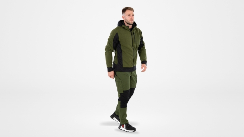 Bluza polarowa z kapturem, funkcyjnymi strefami i pięcioma kieszeniami. Łączy w sobie cechy odzieży roboczej oraz komfort i swobodę ruchów znane z odzieży outdoorowej.