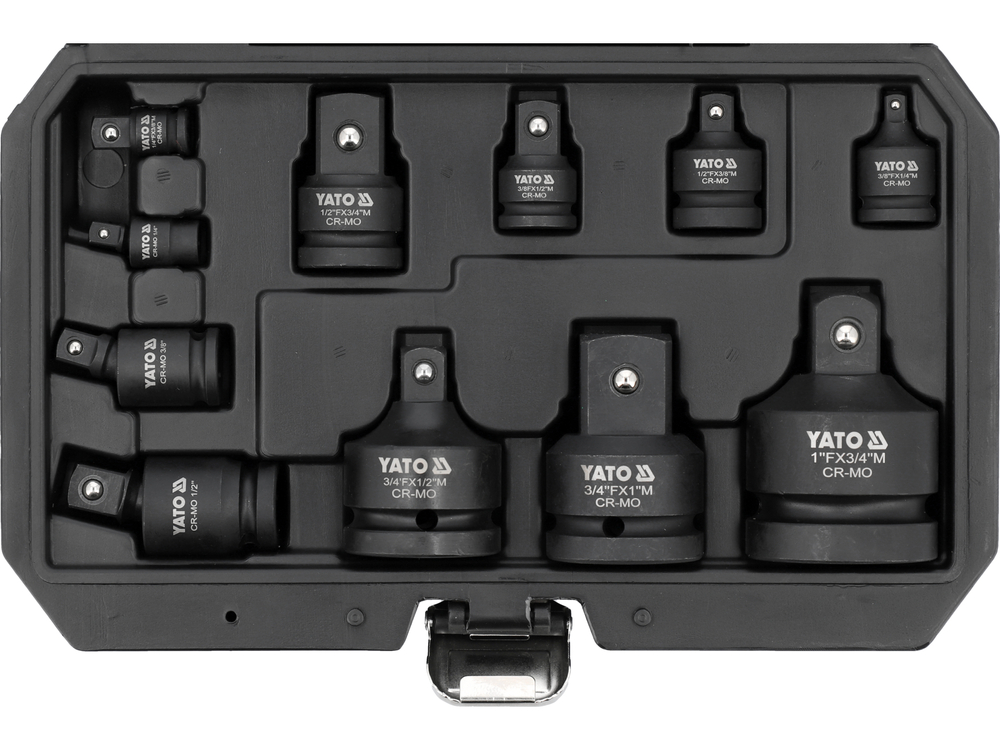 Zestaw udarowych redukcji i przegubów do stosowania w przemyśle mechanicznym, serwisach motoryzacyjnych m.in. do napraw głowic, piast, wrzecion, układów napędowych czy skrzyni biegów.