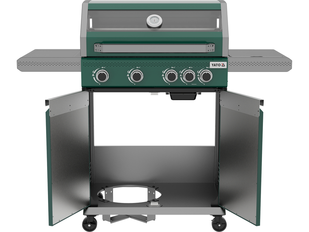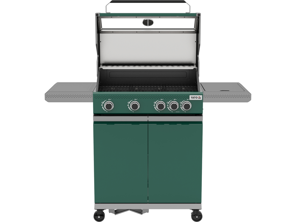 Nowoczesny grill gazowy 4 + 1 z serii YATO Itami w unikalnym zielono-szarym kolorze. Wyposażony w niezawodny, żeliwny ruszt o powierzchni 68 x 42 cm oraz kratkę podgrzewającą ze stali nierdzewnej. Łączna moc palników wynosi 14,2 kW. Półki boczne oraz pojemna, zamykana szafka ułatwiają przechowywanie przypraw i niezbędnych akcesoriów.