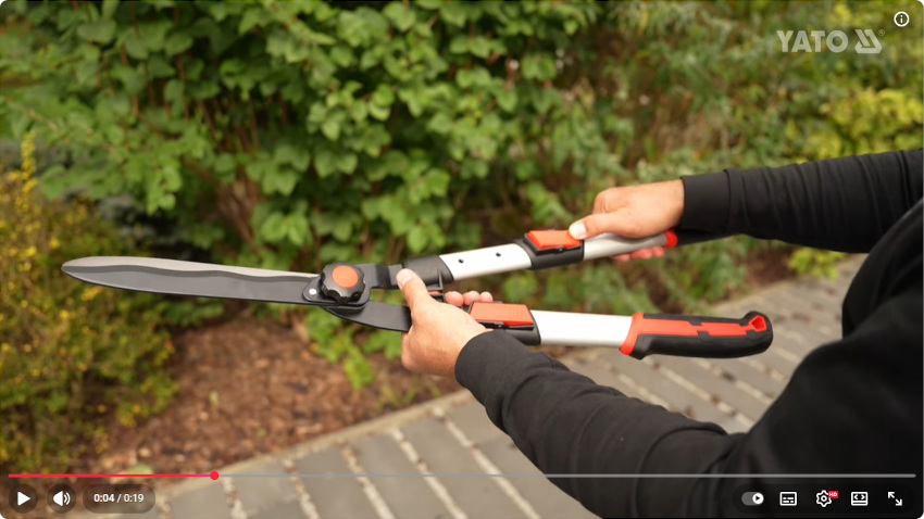 - Teleskopowa regulacja długości (od 660 do 825 mm) umożliwiająca wygodne przycinanie żywopłotów na różnych wysokościach