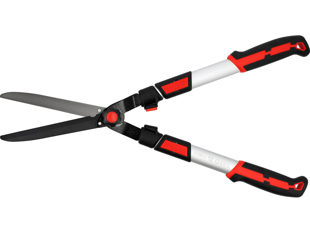 Teleskopowe nożyce do żywopłotu z regulacją długości od 660 do 825 mm umożliwiają wygodne przycinanie żywopłotów na różnych wysokościach. Proste ostrza długości 220 mm wykonane z odpornej stali węglowej 65 Mn, w górnej części pokryte PTFE, zapewniają precyzyjne i czyste cięcie gałęzi do średnicy 6 mm, ułatwiając codzienną pielęgnację krzewów ogrodowych i kształtowanie żywopłotu.