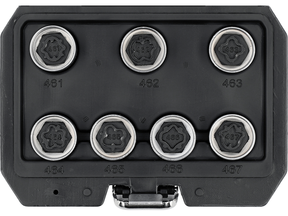 Zestaw nasadek do śrub zabezpieczających w samochodach marki Opel. Przeznaczony do użytku w profesjonalnych warsztatach samochodowych i wulkanizacyjnych.
