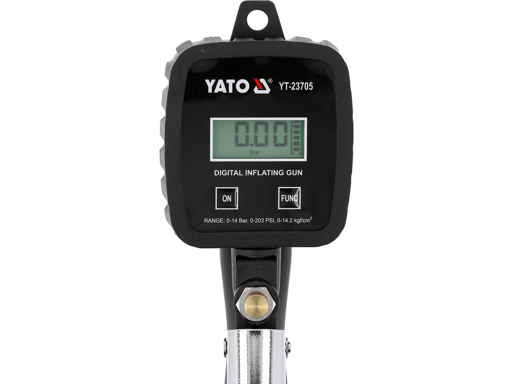 Pistolet do pompowania kół z cyfrowym panelem sterowania łączy precyzyjny układ pomiarowy z ergonomiczną konstrukcją. Urządzenie sterowane jest za pomocą panelu elektronicznego z czytelnym wyświetlaczem LCD, który umożliwia nastawę i odczyt żądanej wartości ciśnienia oraz śledzenie procesu pompowania w czasie rzeczywistym.