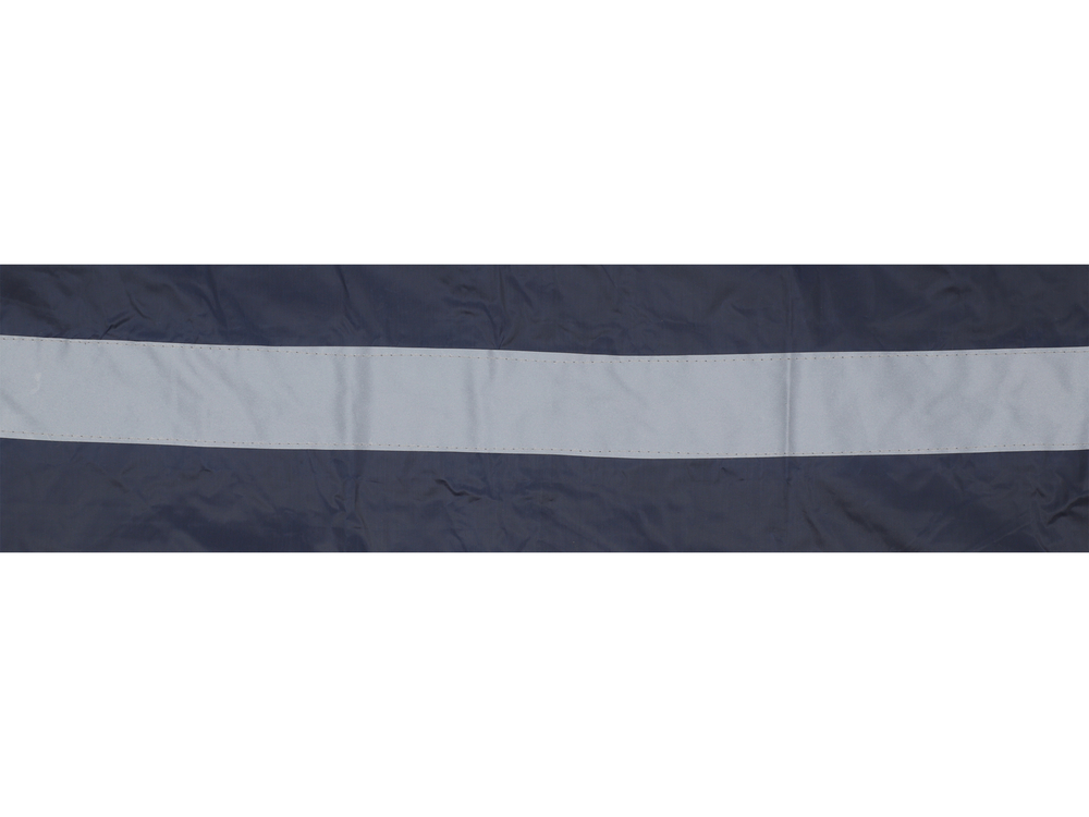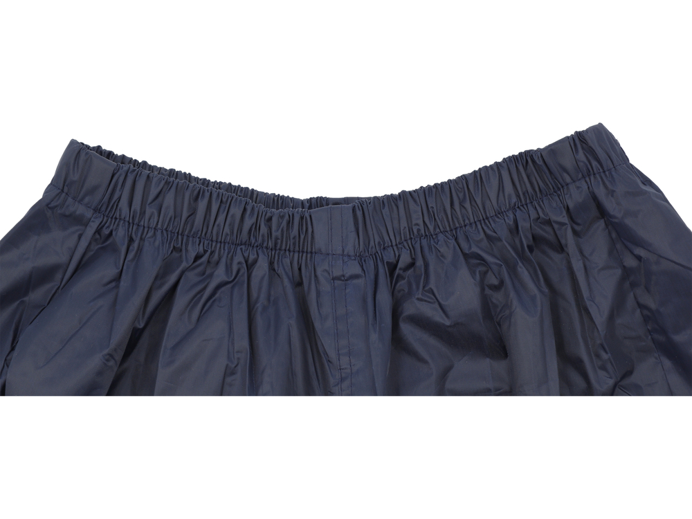 Komplet przeciwdeszczowy 2-częściowy z poprawiającymi widoczność pasami odblaskowymi. Kurtka z dwiema dużymi kieszeniami i regulowanym kapturem, spodnie z rozciągliwą gumką w pasie oraz ze szczelinami po bokach przez które możemy sięgnąć do kieszeni spodni.