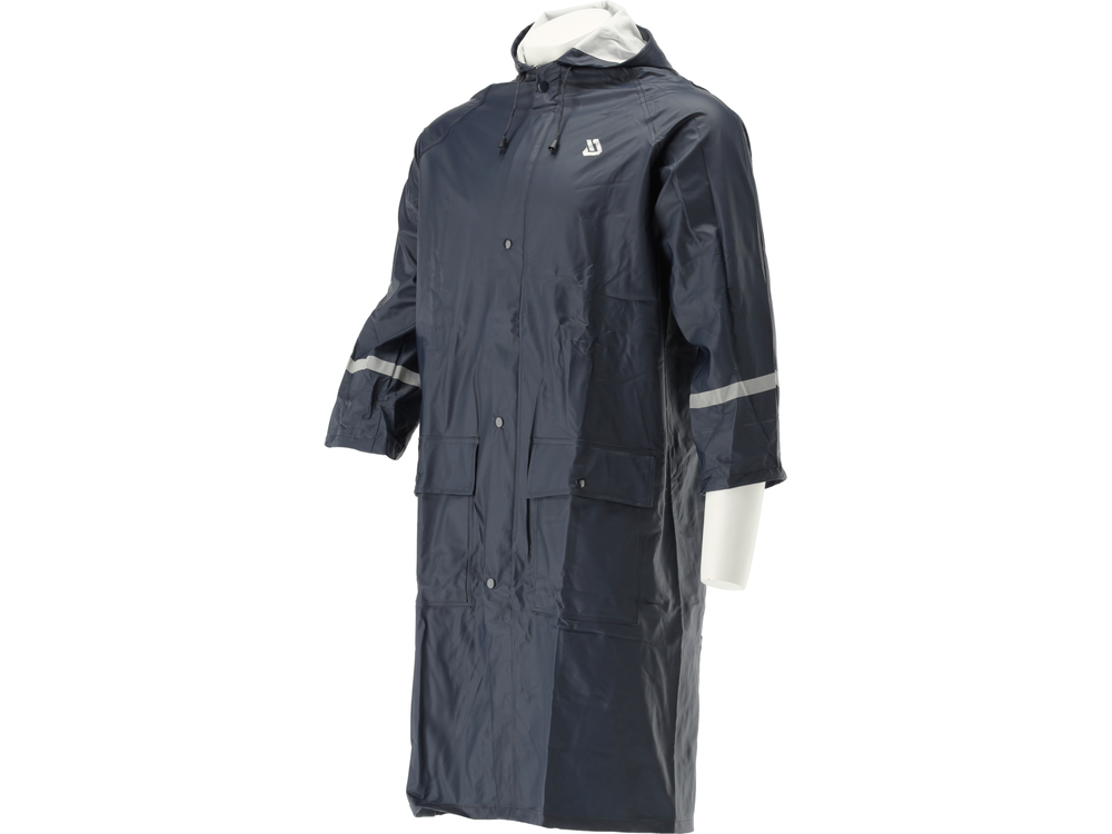 Płaszcz przeciwdeszczowy z rociągliwego materiału, z poprawiającymi widoczność pasami odblaskowymi, z dwiema dużymi kieszeniami i regulowanym kapturem.
