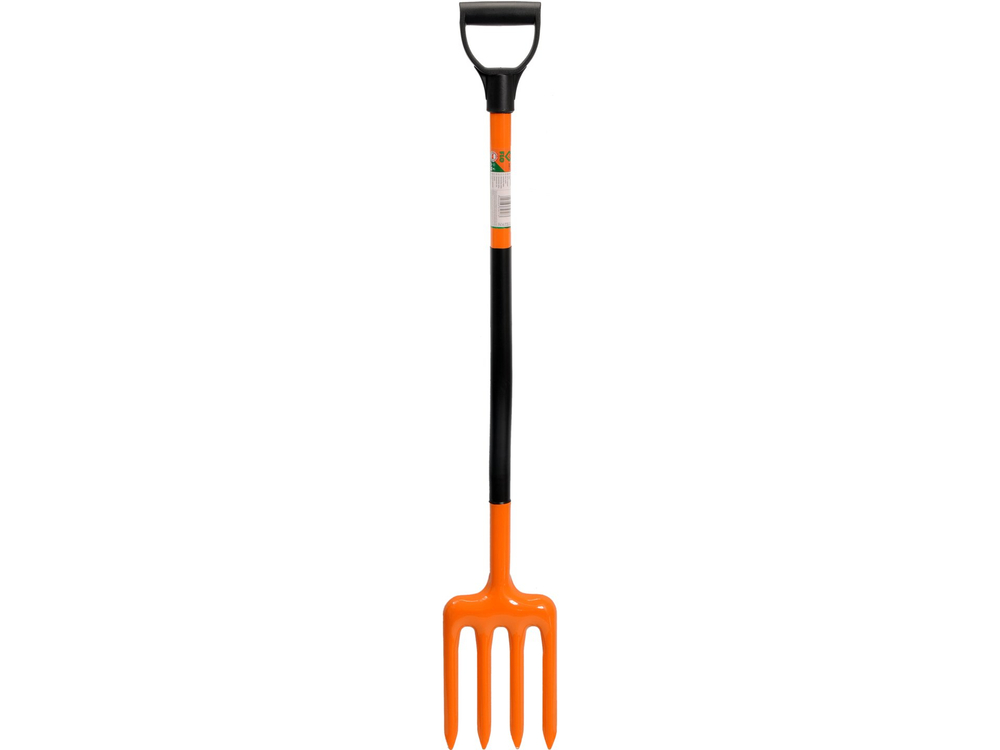 Garfo de jardim Florange com cabo ergonómico em metal, com acabamento em cabo "DY-plastic" com tampões cor de laranja. Têm um cabo de aço perfilado com 32 mm de diâmetro.