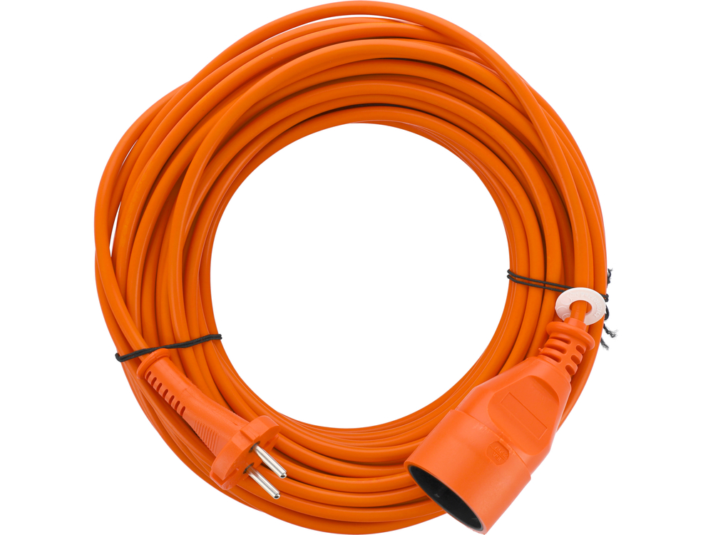 Um cabo de extensão de tomada única com 20 m de comprimento e isolamento laranja espesso. Útil em casa e na garagem. Potência máxima do aparelho a ligar: 1380 W.