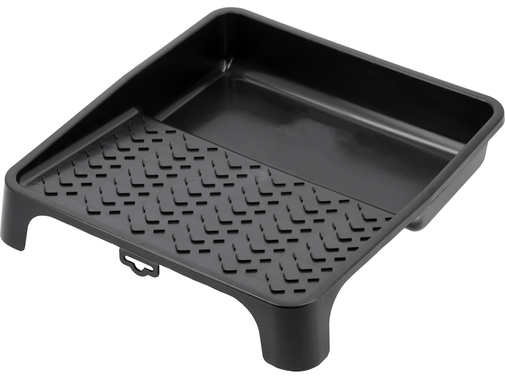 Cuvete de 330x350 mm em plástico. A forma especialmente perfilada permite que a tinta seja apanhada de forma confortável e rápida e que o excesso de tinta seja espremido do rolo ou do pincel.