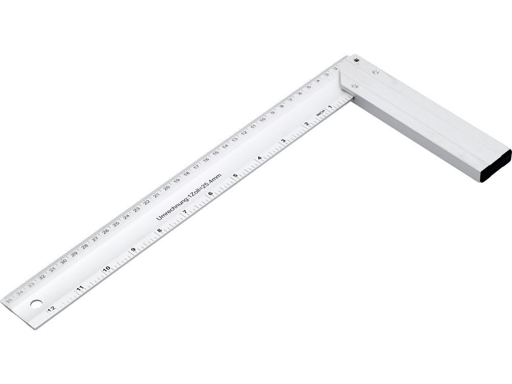 Cantoneira com pé inteiramente em alumínio temperado, com graduações milimétricas pretas legíveis aplicadas. A articulação entre o pé e o braço marca um ângulo de 45°.