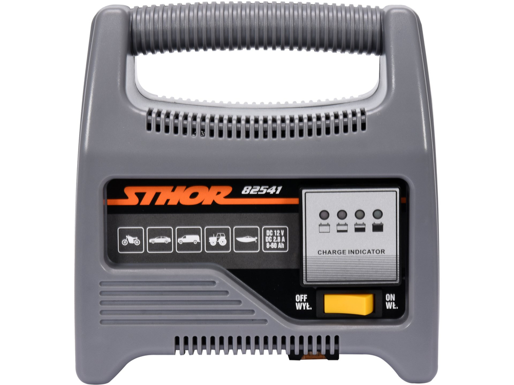 O retificador da marca STHOR possui um transformador toroidal, fusível de proteção contra sobrecarga e sobretensão, interrutor de corrente, led indicador do nível de carga.