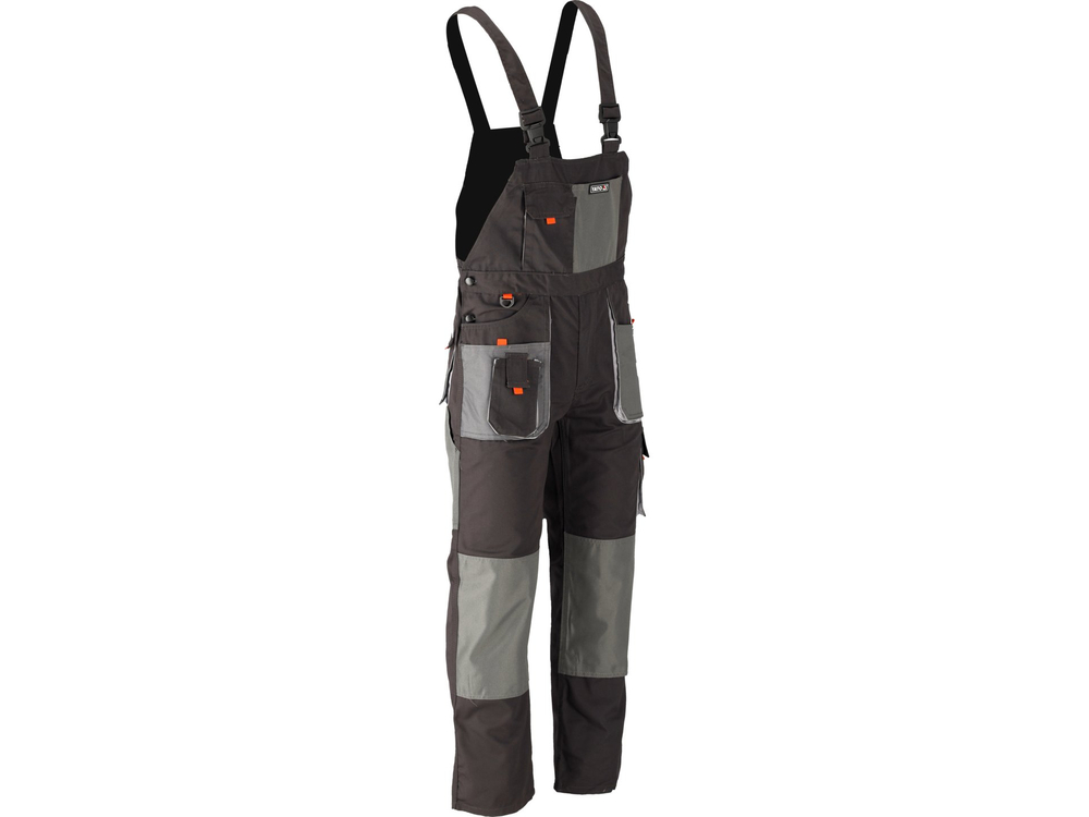 Calças de trabalho tipo arnês com onze bolsos, sete dos quais com fechos de velcro e bolsos especiais para joelheiras.