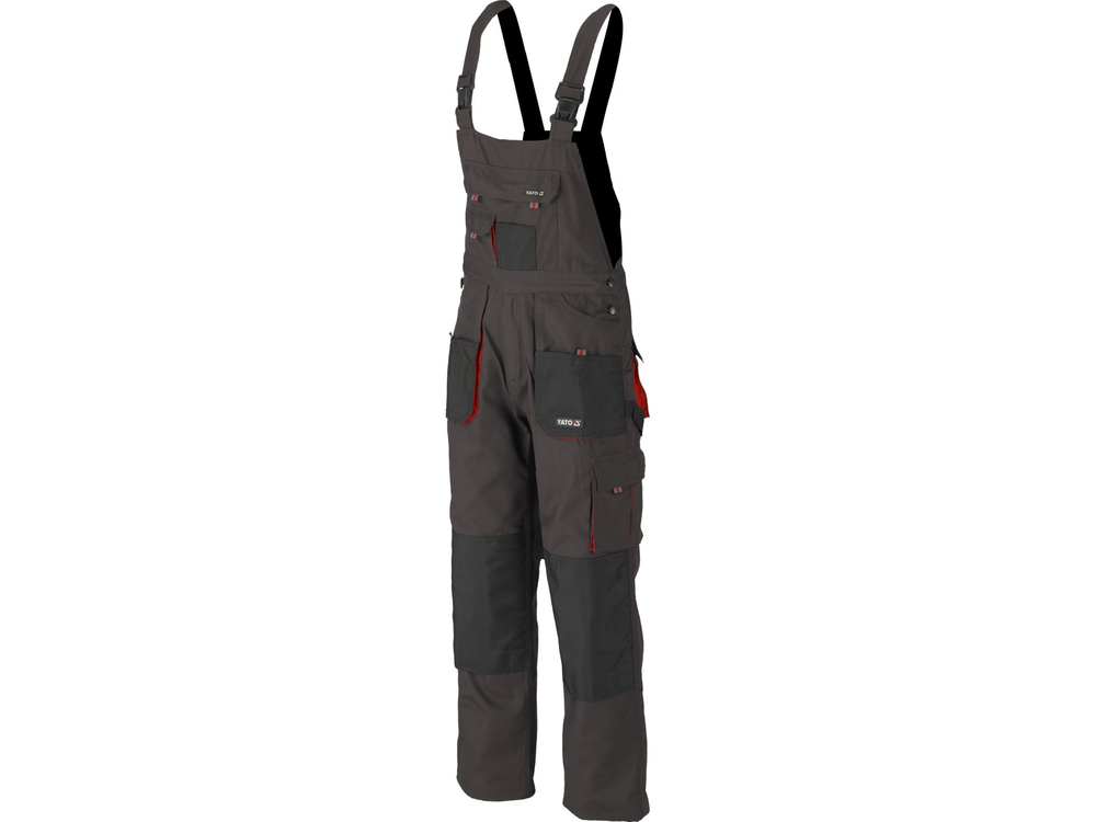 Calças de trabalho tipo arnês com onze bolsos, sete dos quais com fechos de velcro e bolsos especiais para joelheiras.